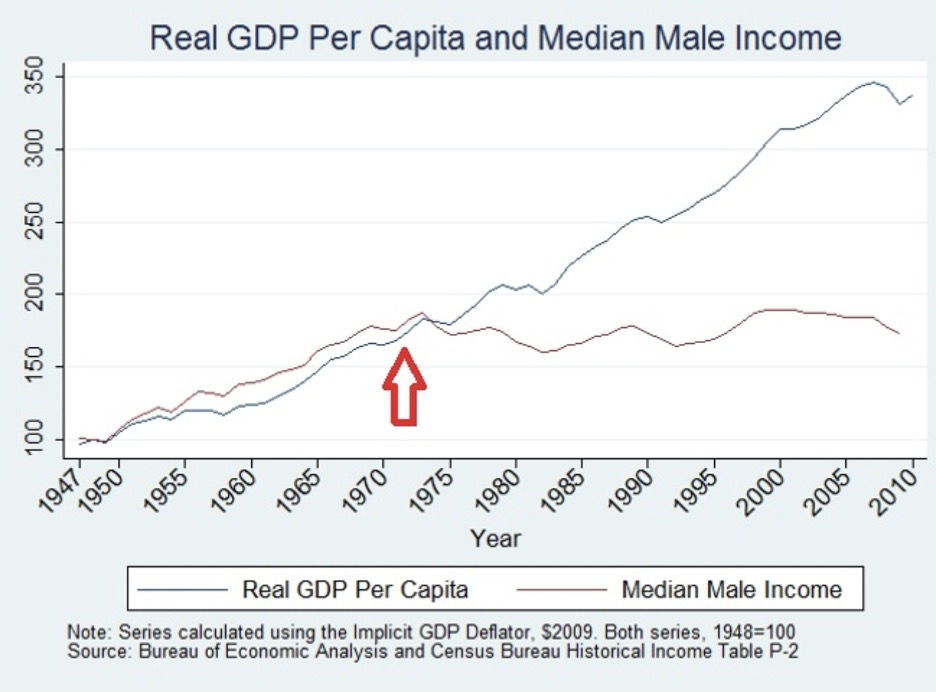 The multi-decade stagnation in male median incomes is particularly stark. Yet Winship has an answer for that, too. Rather than look at the above chart and see a crisis, Winship simply sees the success of womenโs liberation: โMenโs pay rose more than productivity did for decades during the mid-20th century, suggesting that it was due for a correction.โ Note this is not settled fact but rather Winshipโs own pet theory, based on the presumption that โmany men were, relative to productivity levels, overpaid in the pastโthat they received economic rents.โ The entry of women into the workforce thus eroded this rent, construed as a premium for the male breadwinner. Yet why this โcorrectionโ occurred so suddenly and persisted for forty years is left unexplained. An alternative explanation is that male wages grew faster than productivity growth in the preceding decades because of the strength of trade unions, which redistributed rents not between women and men but between capital and labor. This then suddenly reversed in the 1970s amid an energy shock, plummeting union membership, and an economic restructuring that concentrated job losses in male-dominated manufacturing sectors. But I guess as men they had it coming to them.